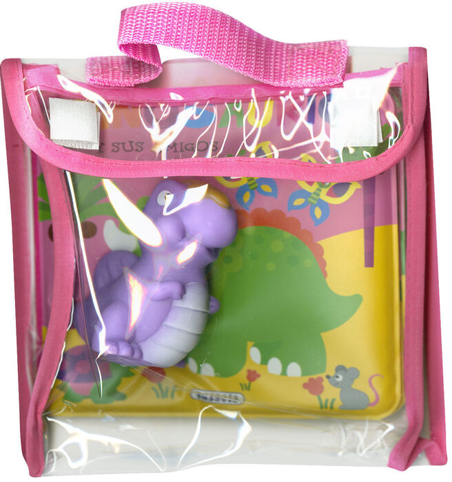 Un libro de plástico acolchado con ilustraciones a todo color de unsimpático dinosaurio y sus amigos, y un muñeco de goma con sonidopensados para que los más pequeños de la casa disfruten siempre de lahora del baño.
