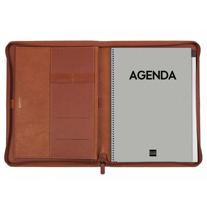 Portadocumentos de mano equipado con Agenda anual de espiral y Bloc de notas. Cierre con cremallera de alta calidad, con carro metálico y tirador de plástico. Muy resistente al uso. Diseño profesional y elegante, perfecto para profesionales que se desplazan habitualmente y necesitan disponer en un único lugar todos los elementos para trabajar. Gracias al bloc de notas que incorpora se pueden tomar anotaciones en cualquier momento. El bolsillo interior con fuelle y cierre permite ubicar una tablet de hasta 10" o bien documentos y mantenerlos seguros. Este portadocumentos incorpora dos anillas portabolígrafo para tener siempre a mano dos elementos de escritura y compartimentos de goma elástica para guardar otros elementos como la memoria USB, auriculares u otros indispensables. También dispone de una ranura extra de fácil acceso para papeles. Detalles de la marca en el interior y en el exterior. El material exterior es poliuretano de alta calidad efecto piel. Diseñado para un uso intensivo y vida duradera. Formato ideal para profesionales y particulares que desean ubicar en un solo lugar todos los documentos.