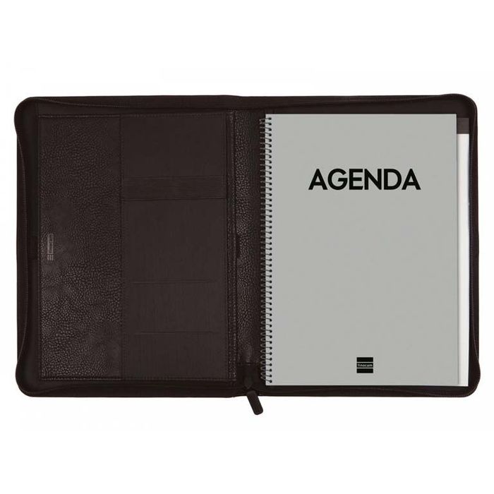 Portadocumentos de mano equipado con Agenda anual de espiral y Bloc de notas. Cierre con cremallera de alta calidad, con carro metálico y tirador de plástico. Muy resistente al uso. Diseño profesional y elegante, perfecto para profesionales que se desplazan habitualmente y necesitan disponer en un único lugar todos los elementos para trabajar. Gracias al bloc de notas que incorpora se pueden tomar anotaciones en cualquier momento. El bolsillo interior con fuelle y cierre permite ubicar una tablet de hasta 10" o bien documentos y mantenerlos seguros. Este portadocumentos incorpora dos anillas portabolígrafo para tener siempre a mano dos elementos de escritura y compartimentos de goma elástica para guardar otros elementos como la memoria USB, auriculares u otros indispensables. También dispone de una ranura extra de fácil acceso para papeles. Detalles de la marca en el interior y en el exterior. El material exterior es poliuretano de alta calidad efecto piel. Diseñado para un uso intensivo y vida duradera. Formato ideal para profesionales y particulares que desean ubicar en un solo lugar todos los documentos.