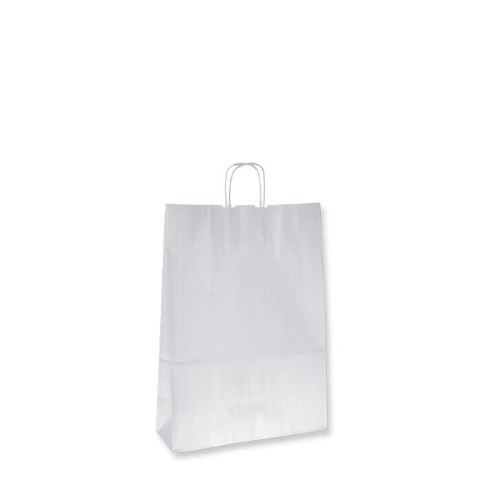 Bolsas en papel kraft de color Blanco. Kraft liso, asa de papel retorcido, 100 gramos. Medidas: 25 x 10 x 32 cm.