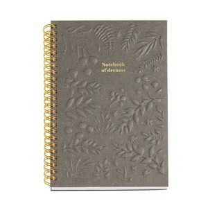 Cubiertas de cartón con grabado. Mensaje en stamping dorado. Doble espiral dorado. Papel marfil rayado. 80 hojas / 80 g 146 x 214 mm