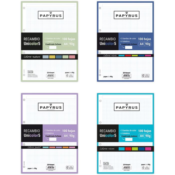 Papel super resistente extrablanco «paperclas90g». Interior rayado en azul. Hojas con 4 taladros. Gramaje 90g/m². Formato DIN-A4 y DIN-A5. Paquete de 100 hojas. Con recuadro en 5 colores. Papel Certificado FSC®.