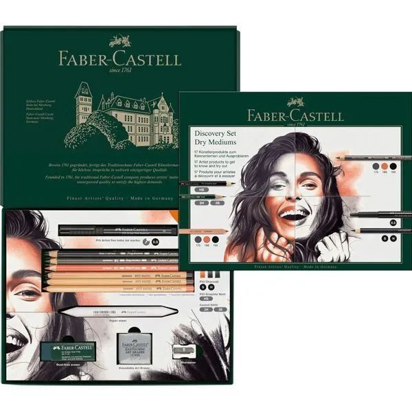 Descubre el Discovery Set de materiales de arte seco Faber-Castell, diseñado tanto para principiantes como para artistas experimentados. Este set versátil permite experimentar y dominar diferentes técnicas de pintura en seco, ideal para dibujar, esbozar, ilustrar y escribir.